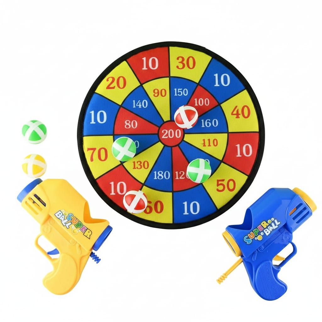 .تحتوي على مسدسين تصويب ملونين ولوحة أهداف دائرية مع كرات لاصقة تلتصق بالهدف عند التصويب